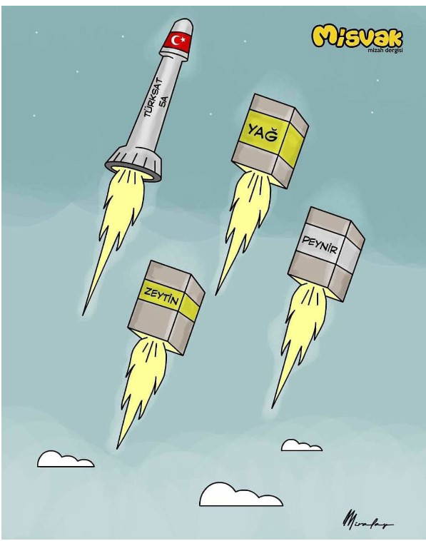 Türkiye'nin uzaya gönderdiği Türksat 5A uydusu ile birlikte yağ, zeytin, peynir gibi ürünlerin de uçtuğunu işleyen Misvak, karikatürü sosyal medyadan paylaştı. Misvak'ın bu karikatürünü kullanıcılar, "Fareler gemiyi terketmeye başladığına göre gemi su almaya başlamış" şeklinde yorumladı.