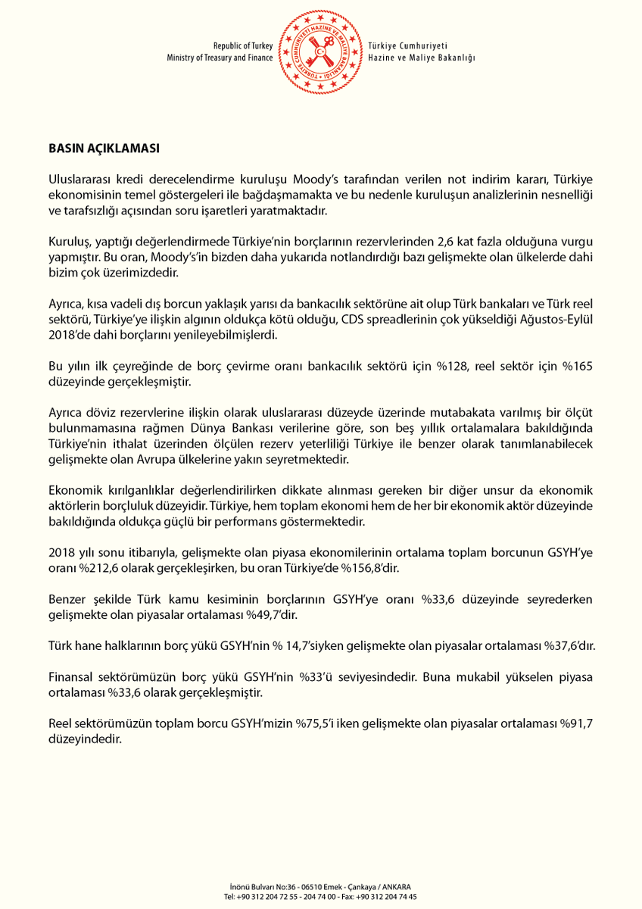 Bakanlıktan yapılan yazılı açıklamada "Uluslararası kredi derecelendirme kuruluşu Moody's tarafından verilen not indirim kararı, Türkiye ekonomisinin temel göstergeleri ile bağdaşmamakta ve bu nedenle kuruluşun analizlerinin nesnelliği ve tarafsızlığı açısından soru işaretleri yaratmaktadır" denildi.