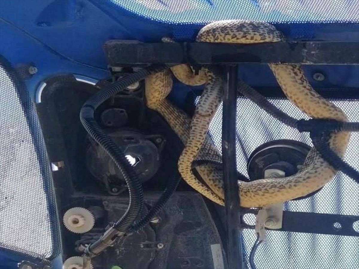 tarlaya geldi. Traktörün kaputunu açan ekipler, yılanı bulunduğu yerden çıkardı.