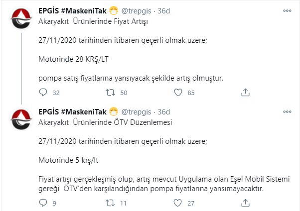 Yapılan zam, pompa fiyatlarına yansıyacak. EPGİS'ten yapılan açıklamada, "Motorinde 28 KRŞ/LT pompa satış fiyatlarına yansıyacak şekilde artış olmuştur. Akaryakıt Ürünlerinde ÖTV Düzenlemesi 27/11/2020 tarihinden itibaren geçerli olmak üzere; Motorinde 5 krş/lt Fiyat artışı gerçekleşmiş olup, artış mevcut Uygulama olan Eşel Mobil Sistemi gereği ÖTV’den karşılandığından pompa fiyatlarına yansımayacaktır" denildi.