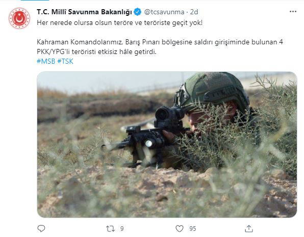 Bakanlığın Twitter'daki hesabından yapılan açıklamada, "Her nerede olursa olsun teröre ve teröriste geçit yok. Kahraman komandolarımız, Barış Pınarı bölgesine saldırı girişiminde bulunan 4 PKK/YPG’li teröristi etkisiz hâle getirdi" denildi.