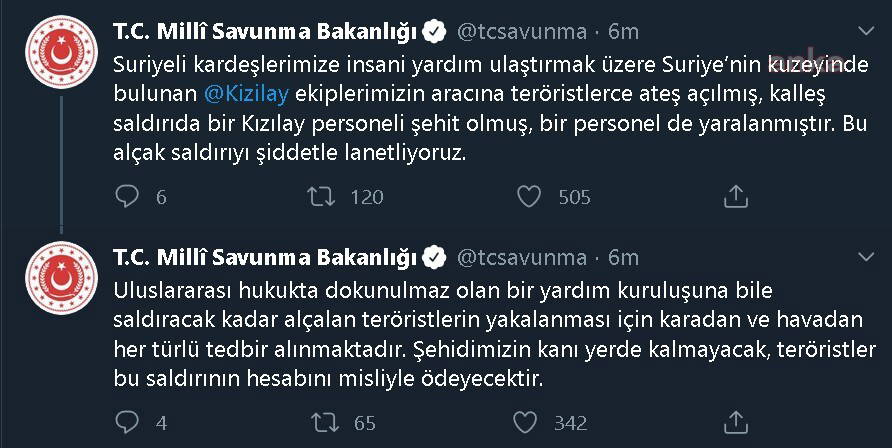 "Suriyeli kardeşlerimize insani yardım ulaştırmak üzere Suriye’nin kuzeyinde bulunan Kizilay ekiplerimizin aracına teröristlerce ateş açılmış, kalleş saldırıda bir Kızılay personeli şehit olmuş, bir personel de yaralanmıştır. Bu alçak saldırıyı şiddetle lanetliyoruz. Uluslararası hukukta dokunulmaz olan bir yardım kuruluşuna bile saldıracak kadar alçalan teröristlerin yakalanması için karadan ve havadan her türlü tedbir alınmaktadır. Şehidimizin kanı yerde kalmayacak, teröristler bu saldırının hesabını misliyle ödeyecektir"
