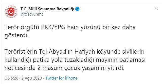 Bakanlığın sosyal paylaşım sitesi Twitter'daki hesabından yapılan açıklamada, "Terör örgütü PKK/YPG hain yüzünü bir kez daha gösterdi. Teröristlerin Tel Abyad’ın Hafiyah köyünde, sivillerin kullandığı patika yola tuzakladığı mayının patlaması neticesinde 2 masum çocuk yaşamını yitirdi" denildi.