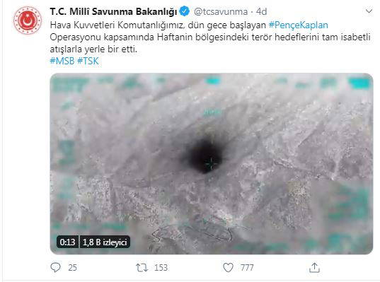 Bakanlığın Twitter hesabından yapılan açıklamada, "Hava Kuvvetleri Komutanlığımız, dün gece başlayan Pençe-Kaplan Operasyonu kapsamında Haftanin bölgesindeki terör hedeflerini tam isabetli atışlarla yerle bir etti" denildi.
