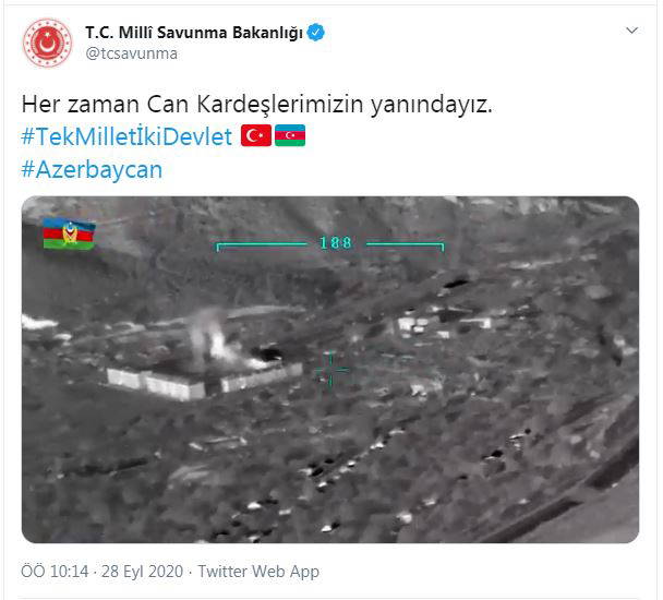 Bakanlığın Twitter hesabından 'Tek Millet İki Devlet' etiketiyle yapılan paylaşımda, "Her zaman can kardeşlerimizin yanındayız" denildi. Türkiye ile Azerbaycan bayraklarının yer aldığı paylaşımda, tatbikattan çekilen görüntüler de yer aldı.