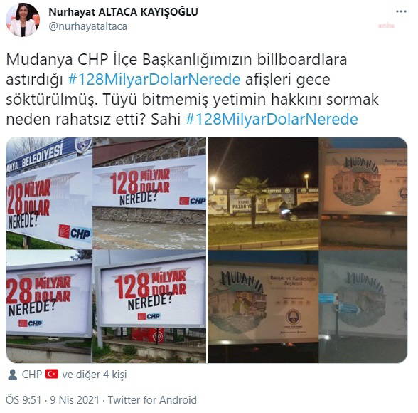 "Mudanya CHP İlçe Başkanlığımızın billboardlara astırdığı ‘128 Milyar Dolar Nerede’ afişleri gece söktürülmüş. Tüyü bitmemiş yetimin hakkını sormak neden rahatsız etti? Sahi 128 Milyar Dolar Nerede?”