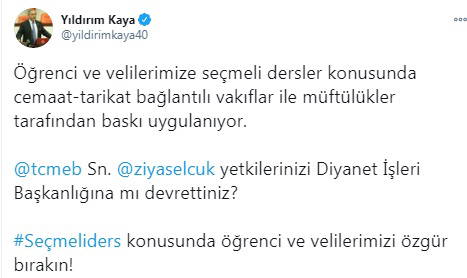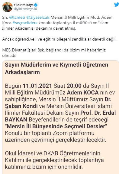 Gönderilen mesajı sosyal medya hesabından paylaşan Kaya, "Öğrenci, veli ve eğitim bileşeni sendikalar davetli değil. MEB Diyanet İşleri Bşk. bağlandı da bizim mi haberimiz olmadı!" dedi.