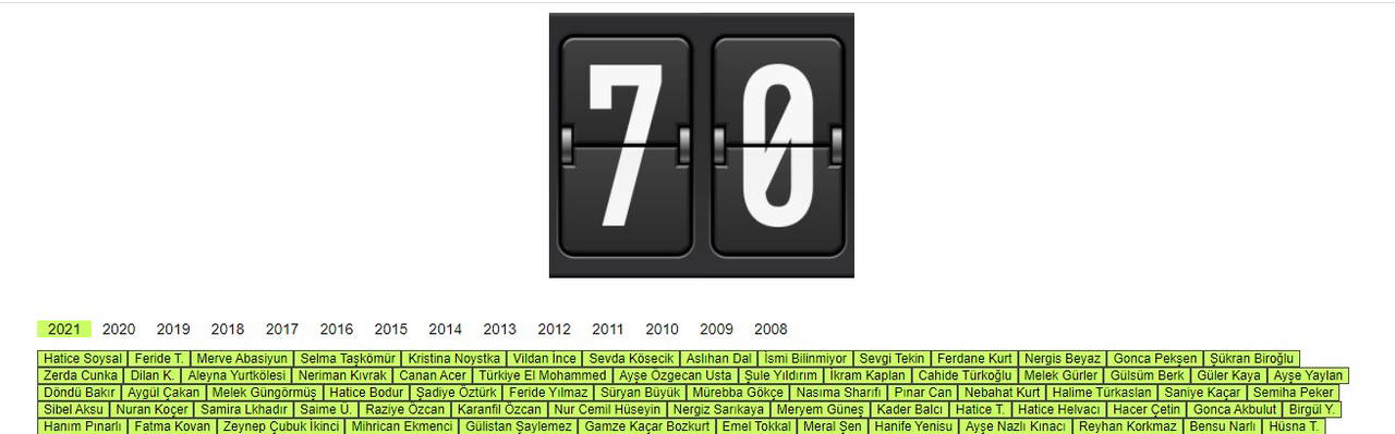 Platformun öldürülen kadınların anısına 'Anıt Sayaç' ta 2021'in ilk 72 gününde öldürülen kadınların isimleri yer verildi. Listede bir kadının ismi ise 'bilinmiyor' olarak yer aldı.