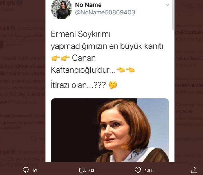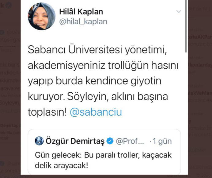 Hilal Kaplan Sabancı Twitter’dan yaptığı paylaşımda “Sabancı Üniversitesi yönetimi, akademisyeniniz trollüğün hasını yapıp burda kendince giyotin kuruyor. Söyleyin, aklını başına toplasın!” dedi.