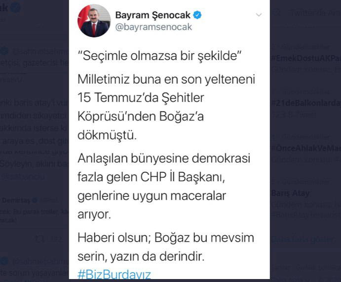 AKP İstanbul İl Başkanı Bayram Şenocak, CHP İstanbul İl Başkanı Canan Kaftancıoğlu’nu AKP’ye yönelik açıklamalarının ardından “Haberi olsun; Boğaz bu mevsimde serin, yazın da derindir” sözleriyle tehdit etti.