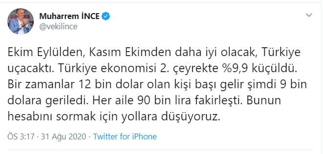 “Memleket Hareketi”ne 4 Eylül’de Sivas’tan başlayağını açıklayan Muharrem İnce, Türkiye ekonomisinin bu yılın ikinci çeyreğinde yüzde 9.9 daralmasını eleştirdi.