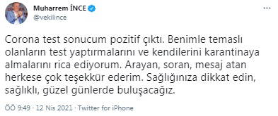 "Corona test sonucum pozitif çıktı. Benimle temaslı olanların test yaptırmalarını ve kendilerini karantinaya almalarını rica ediyorum" diyen İnce, "Arayan, soran, mesaj atan herkese çok teşekkür ederim. Sağlığınıza dikkat edin, sağlıklı, güzel günlerde buluşacağız" ifadeleri kullandı.