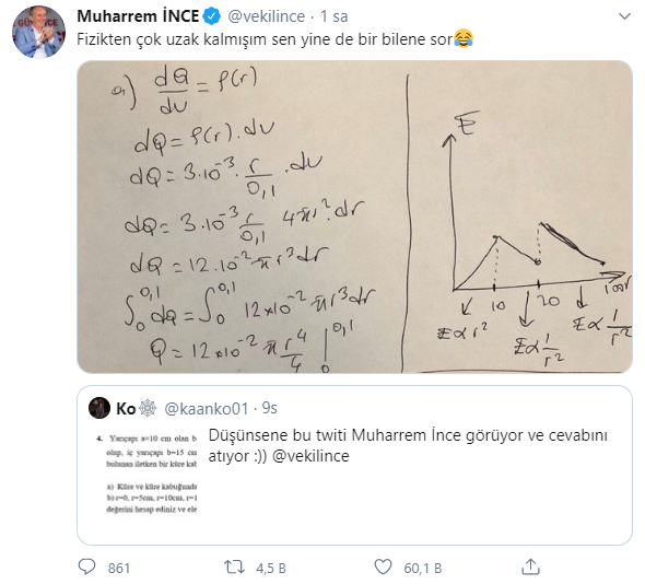 Bir öğrenci, Twitter hesabı üzerinden bir fizik sorusu paylaşarak, "Düşünsene bu twiti Muharrem İnce görüyor ve cevabını atıyor" diye yazdı.