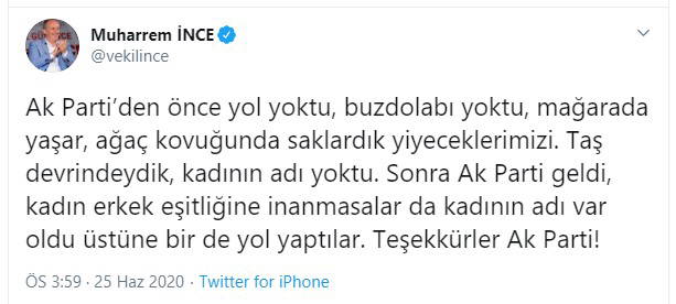 İnce, sosyal medya hesabından yaptığı paylaşımda, "Ak Parti geldi, kadın erkek eşitliğine inanmasalar da kadının adı var oldu; üstüne bir de yol yaptılar. Teşekkürler Ak Parti" yanıt verdi.