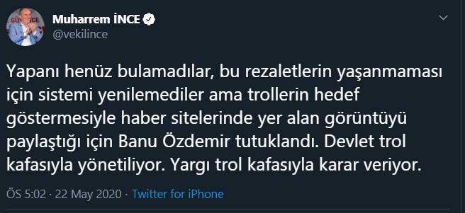 "Yapanı henüz bulamadılar, bu rezaletlerin yaşanmaması için sistemi yenilemediler ama trollerin hedef göstermesiyle haber sitelerinde yer alan görüntüyü paylaştığı için Banu Özdemir tutuklandı. Devlet trol kafasıyla yönetiliyor. Yargı trol kafasıyla karar veriyor."