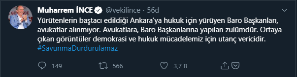 Yürüyüşün “Valilik izni yok” gerekçesiyle engellenmesine Muharrem İnce’den sert tepki geldi. İnce, sosyal medya paylaşımında “Yürütenlerin baştacı edildiği Ankara'ya hukuk için yürüyen baro başkanları, avukatlar alınmıyor. Avukatlara, baro başkanlarına yapılan zulümdür. Ortaya çıkan görüntüler demokrasi ve hukuk mücadelemiz için utanç vericidir” ifadelerine yer verdi.