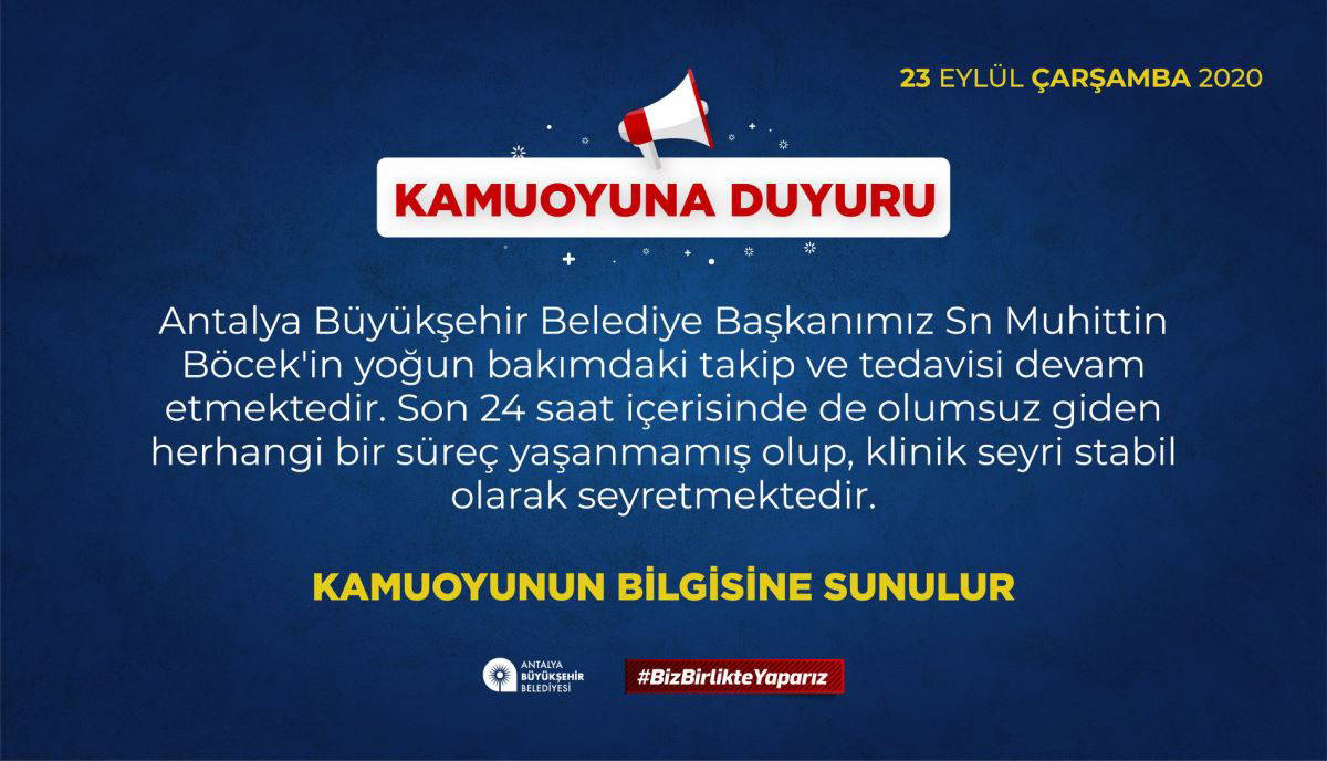 "Antalya Büyükşehir Belediye Başkanımız Sn. Muhittin Böcek'in yoğun bakımdaki takip ve tedavisi devam etmektedir. Son 24 saat içerisinde de olumsuz giden herhangi bir süreç yaşanmamış olup, klinik seyri stabil olarak devam etmektedir."