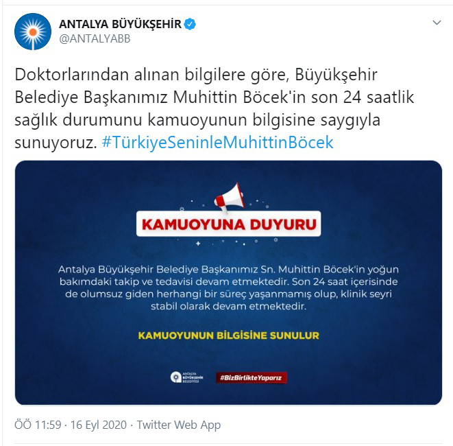 Antalya Büyükşehir Belediyesi'nin sosyal medya hesaplarından yapılan açıklamada, Böcek'in yoğun bakımdaki takip ve tedavisine devam edildiği belirtilerek son 24 saat içerisinde olumsuz herhangi bir süreç yaşanmadığı, klinik seyrinin stabil olduğu ifade edildi.
