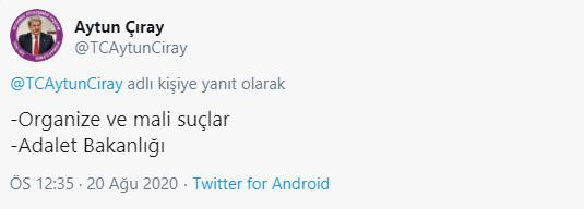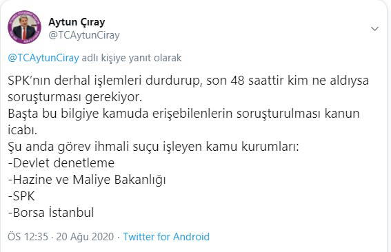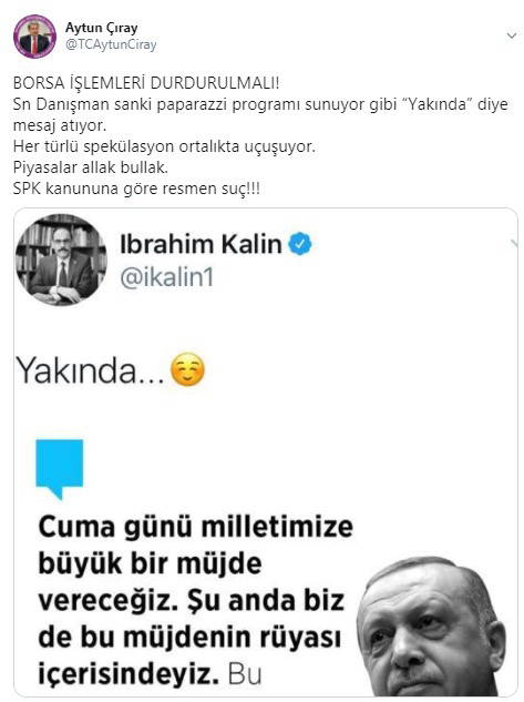 Cumhurbaşkanı Başdanışmanı İbrahim Kalın'ın açıklamalarını alıntılayan Aytun Çıray, "Borsa, işlemleri durdurmalı! Sayın Danışman sanki paparazzi programı sunuyor gibi ‘Yakında’ diye mesaj atıyor. Her türlü spekülasyon ortalıkta uçuşuyor. Piyasalar allak bullak. SPK kanununa göre resmen suç" dedi.