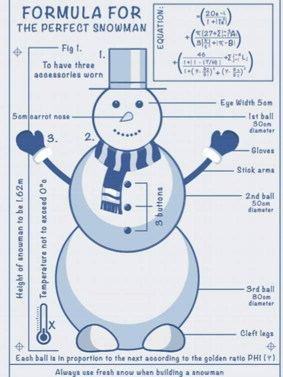Matematikçi Dr. James Hind önderliğinde hazırlanan formüle göre, kar yağışını heyecanla bekleyen çocukların en büyük eğlencelerinden olan kardan adamların dengeli durması içim öncelikle boyunun 1.62 metre olması gerekiyor. Hava sıcaklığının da kar direnci açısından 0 derece ve altında olması öneriliyor.
