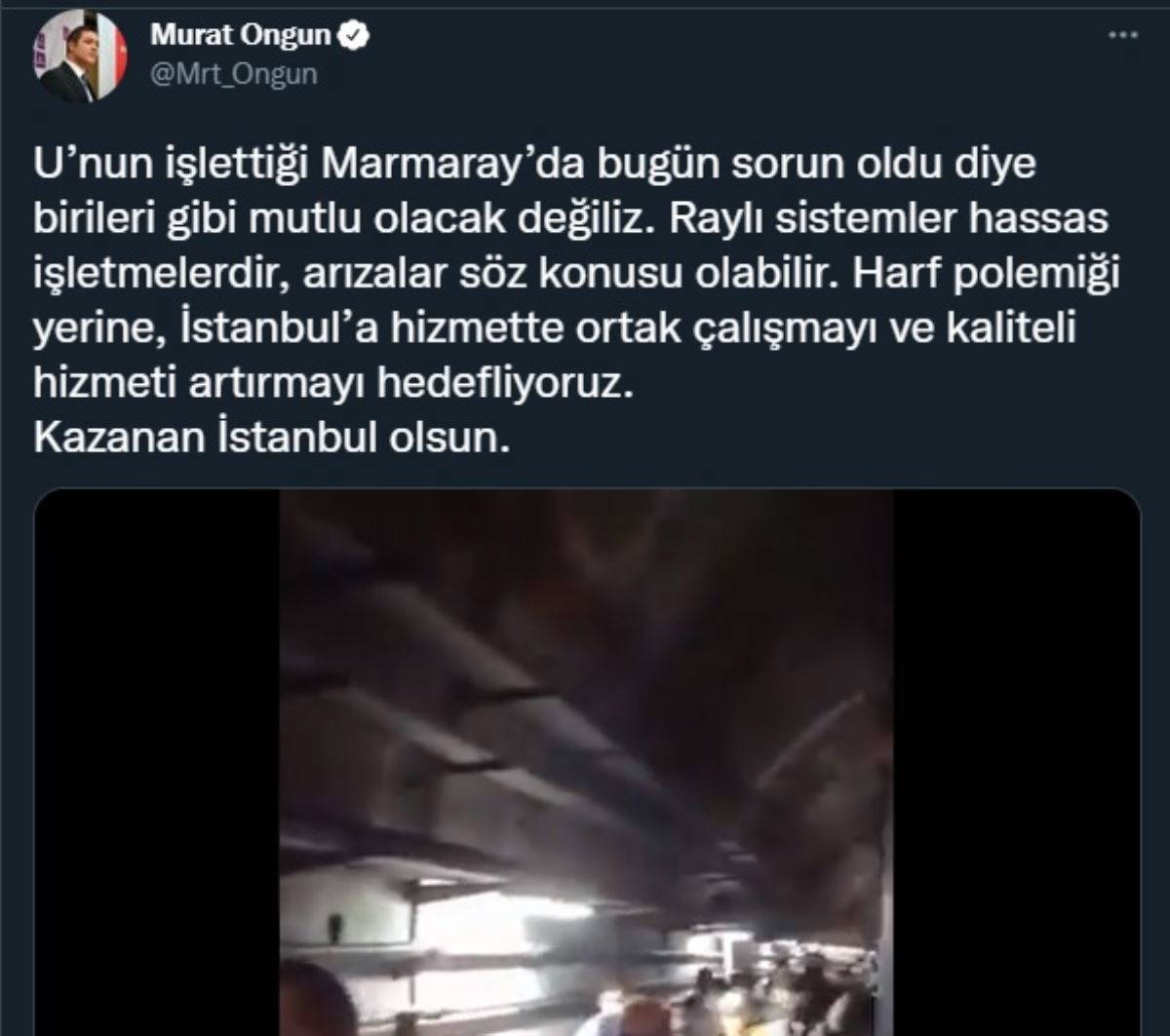 Murat Ongun paylaşımında "U’nun işlettiği Marmaray’da bugün sorun oldu diye birileri gibi mutlu olacak değiliz. Raylı sistemler hassas işletmelerdir, arızalar söz konusu olabilir. Harf polemiği yerine, İstanbul’a hizmette ortak çalışmayı ve kaliteli hizmeti artırmayı hedefliyoruz. Kazanan İstanbul olsun." dedi.