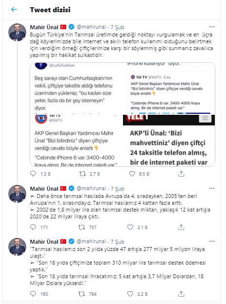 AKP Genel Başkan Yardımcısı Mahir Ünal, Twitter hesabından yaptığı açıklamada "Bugün Türkiye’nin tarımsal üretimde geldiği noktayı vurgulamak ve en ücra dağ köylerimizde bile internet ve akıllı telefon kullanımı olduğunu belirtmek için verdiğim örneği çiftçilerimize karşı bir söylenmiş gibi sunmanız zavallıca yapılmış bir hakikat suikastidir" ifadelerini kullanmış ve ‘muhalif’ medyayı hedef göstermişti.