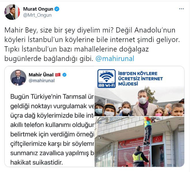 “Mahir Bey, size bir şey diyelim mi? Değil Anadolu’nun köyleri İstanbul’un köylerine bile internet şimdi geliyor. Tıpkı İstanbul’un bazı mahallelerine doğalgaz bugünlerde bağlandığı gibi.”