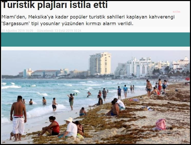 “2019 yılında Meksika’nın Karayip Denizi kıyılarındaki dünyaca ünlü plajları, çamur rengi yosunların istilasına uğradı. 621 mil kıyı etkilendi. Uzmanlar küresel iklim değişimi nedeniyle deniz suyunun ısınması ve deniz akıntılarının yön değiştirmesinin etkili olduğunu ifade etmişlerdi. Bozuk yumurta kokusu yayan yosunlar, turistlerin plajlardan uzak durmasına ve otel rezervasyonlarını iptal etmesine neden oldu.