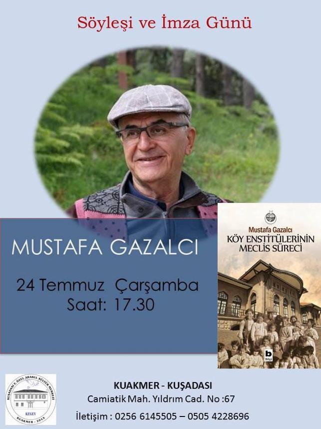 Camiatik Mahallesi Yıldırım Caddesi No: 67 adresinde bulunan Kuşadası Özel Arabul Kültür Merkezi’ndeki (KUAKMER) etkinlik saat 17.30’da başlayacak. Gazalcı ayrıca 1 Ağustos Perşembe günü Burhaniye’de, 4 Ağustos Pazar günü Didim şenliklerinde saat 18.30’da imza günü yapacak.