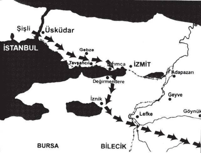 Aşağıdaki harita, Mustafa Kemal’e eğer görev verilseydi Anadolu’ya geçmek için izleyeceği yolu göstecektir. Mustafa Kemal anılarında şöyle diyor: