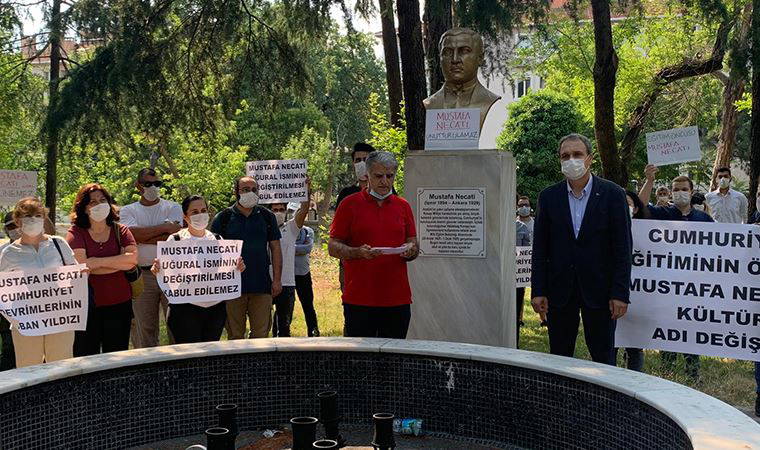 Üsküdar'da bulunan Validebağ Korusu'ndaki Mustafa Necati Bey heykeli önünde basın açıklamasında bulunan CHP'liler, "Bu yapılan, Cumhuriyetin en başarılı, en sevilen, en ilerici Milli Eğitim Bakanlarından Mustafa Necati beyin anısına da, Cumhuriyete de saygısızlıktır. Cumhuriyet Halk Partisi olarak bu işin peşini bırakmayacağız. Mustafa Necati adını silemeyeceksiniz" dedi.