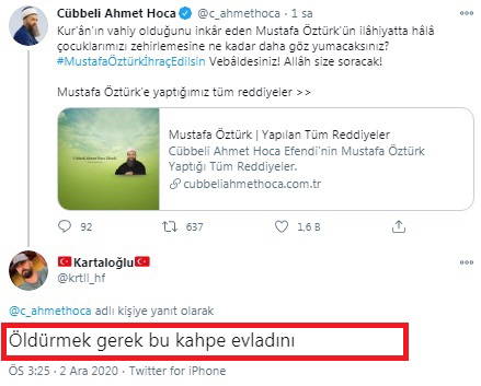 Ünlü'nün cemaat müritleri ve islamcılar tarafından çokça paylaşılan bu çağrısına yanıt verenlerden birinin sözleri ise diğerlerinden hayli farklı oldu. Twitter'da @krtll_hf ismini kullanan bir sosyal medya kullanıcısı, Öztürk'e hem ağır hakarette bulundu hem de öldürülmesi gerektiğini yazdı.