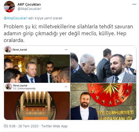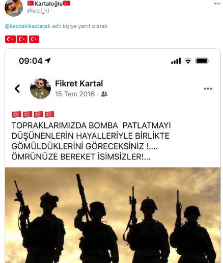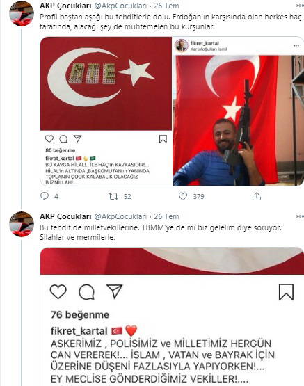 O hesabın yaptığı paylaşımlarda, Fikret Kartal isimli şahsın AKP'li Cumhurbaşkanı Tayyip Erdoğan ile AKP İzmir Milletvekili ve eski Başbakan Binali Yıldırım'la fotoğrafları bulunuyor. Instagram hesabında bayrak ve elinde tüfekle boy gösteren Kartal'ın bunun yanı sıra Cumhurbaşkanlığı Sarayı'nın içerisinde fotoğrafları da yer alıyordu.