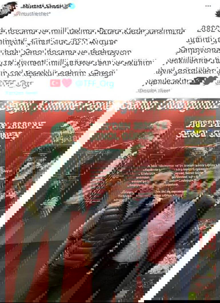 "2002’de hocama ve milli takıma Pazara Kadar şarkımızla uğurlu gelmiştik. Şimdi sıra 2021 Avrupa Şampiyonası'nda! Şenol hocama ve federasyon yetkililerine bu çok kıymetli milli göreve beni ve ekibimi layık gördükleri için çok teşekkür ederim. Gereği yapılacaktır"