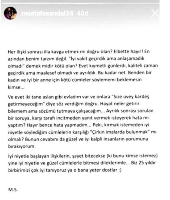Yazılı açıklama yapan Mustafa Sandal, şunları söyledi: "Her ilişki sonrası illa kavga etmek mi doğru olan? Elbette hayır! En azından benim tarzım değil. "İyi vakit geçirdik ama anlaşamadık olmadı" demek midir kötü olan? Evet kıymetli günlerdi, kaliteli zaman geçirdik ama maalesef olmadı ve ayrıldık. Bu kadar net. Benden bir kadın ve iyi bir anne için kötü cümleler söylememi beklemesin kimse…