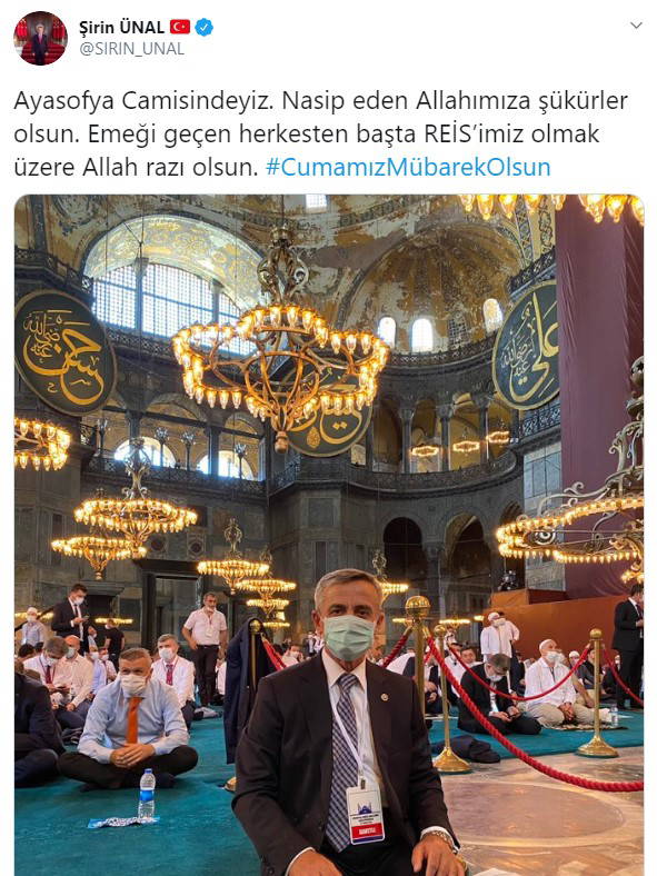 AKP İstanbul Milletvekili Şirin Ünal'ın Ayasofya'nın ibadete açılmasının ardından bugün gerçekleştirilecek olan ilk cuma namazına katılması ve sosyal medya hesabından fotoğraf paylaşması tepki çekti.