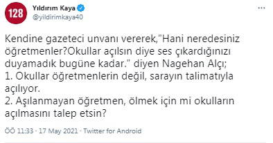 "Kendine gazeteci unvanı vererek,"Hani neredesiniz öğretmenler? Okullar açılsın diye ses çıkardığınızı duyamadık bugüne kadar." diyen Nagehan Alçı;