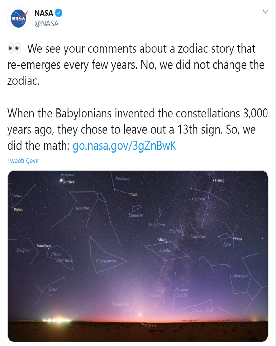 Dün Twitter'da, NASA'nın yeni bir takımyıldızı keşfettiği, bu takımyıldızı nedeniyle de burçların değiştiği iddia edildi. İddialara göre NASA, resmi internet sitesinde yayımladığı bir blog gönderisi ile bu durumu tüm dünyaya duyurmuştu. NASA'nın resmi internet sayfasında iddiaları doğrulayan bir açıklama yer almamasına rağmen, burçların değişimi sosyal medya üzerinde gündeme gelirken aynı zamanda pek çok basın kuruluşu bu iddiayı haberleştirmişti.