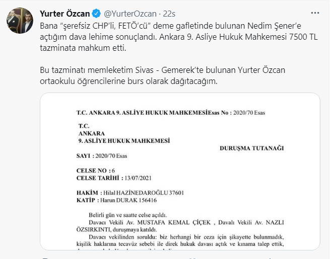 Sosyal medya hesabından konuya ilişkin paylaşım yapan Özcan, ''Bana “şerefsiz CHP’li, FETÖ’cü” deme gafletinde bulunan Nedim Şener’e açtığım dava lehime sonuçlandı. Ankara 9. Asliye Hukuk Mahkemesi 7 bin 500 TL tazminata mahkum etti. Bu tazminatı memleketim Sivas - Gemerek’te bulunan Yurter Özcan ortaokulu öğrencilerine burs olarak dağıtacağım'' ifadelerini kullandı.