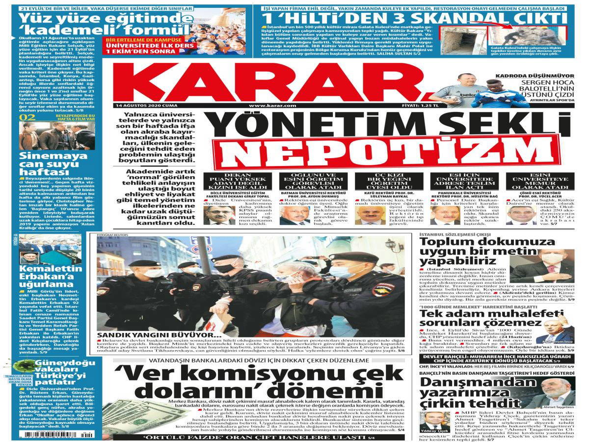 KARAR gazetesi üniversitelerde yaşanan akraba, eş dost kadrolaşmasını manşetine taşıdı.