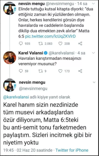 Karel Valansi, Nevşin Mengü'ye "Havraları karıştırmadan mesajınızı veremiyor musunuz?" diye sordu. Tepkinin ardından Mengü, "Karel hanım sizin nezdinizde tüm Musevi arkadaşlardan özür diliyorum, Matta 6:5'teki bu anti-semit tonu fark etmeden paylaştım. Sizleri incitmek gibi bir niyetim yoktu" ifadeleriyle özür diledi.