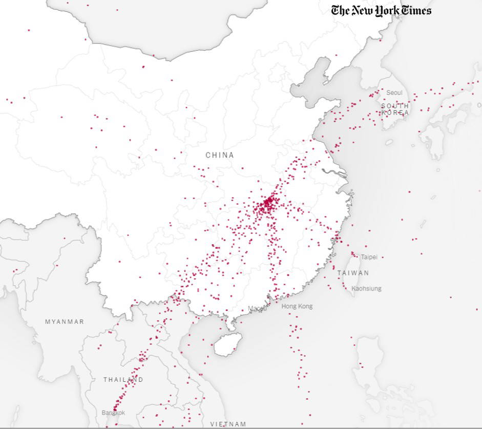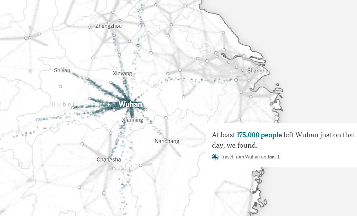 New York Times, web sitesindeki interaktif haritayla birlikte koronavirüsün insanlık tarihindeki en kapsamlı seyahat yasağına rağmen nasıl yayıldığını analiz eden bir makale yayımladı. Milyonlarca kişinin seyahatlerinin resmi verilere göre analiz edildiği makalede, koronavirüsün ilk olarak 11 milyon kişinin yaşadığı Çin’in Vuhan kentindeki deniz ürünleri satan yiyecek pazarında ortaya çıktığı ve virüsün 4 kişide tespit edildiği vurgulandı.