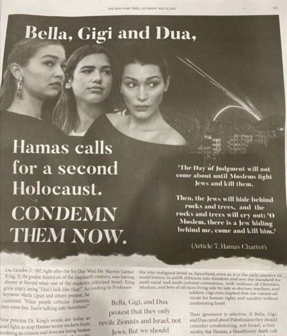 Filistin asıllı ABD'li modeller Bella Hadid ile kardeşi Gigi Hadid ve yine Filistin'e destek veren şarkısı Dua Lipa, New York Times gazetesinde yer alan tam sayfa bir ilanda "İsrail'i kınayıp Hamas'a sessiz kalmakla" suçlandı.