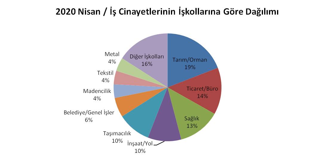 Nisan ayında işçi ölümleri en çok tarım, ticaret/büro, sağlık, inşaat, taşımacılık, belediye/genel işler, madencilik, tekstil, metal, konaklama, güvenlik, ve ağaç/kağıt işkollarında gerçekleşti.