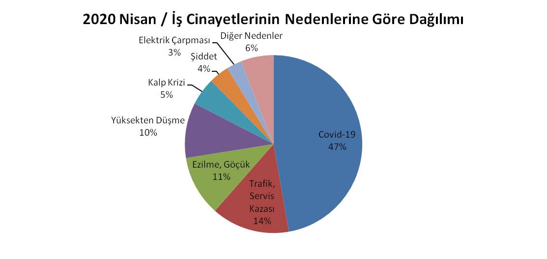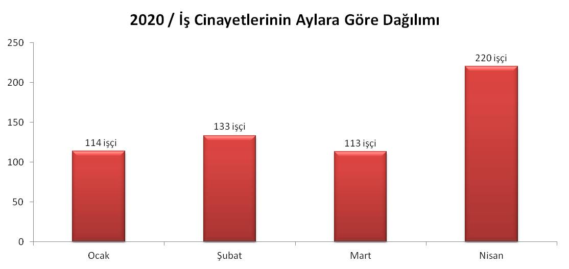 İş cinayetlerinin aylara göre dağılımına bakıldığında ocak ayında en az 114 işçi, şubat ayında en az 133 işçi, mart ayında en az 113 işçi ve nisan ayında en az 220 işçi yaşamını yitirdi. 2020 yılının ilk dört ayında iş cinayetlerinde en az 580 işçi yaşamını yitirdi.
