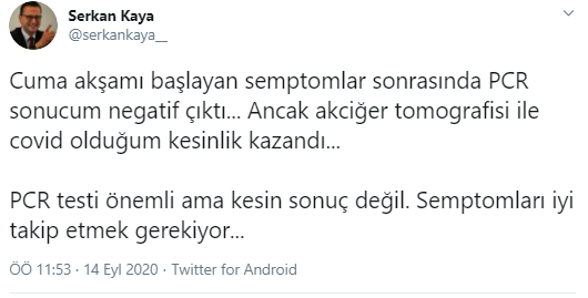 "Cuma akşamı başlayan semptomlar sonrasında PCR sonucum negatif çıktı... Ancak akciğer tomografisi ile covid olduğum kesinlik kazandı... PCR testi önemli ama kesin sonuç değil. Semptomları iyi takip etmek gerekiyor..."