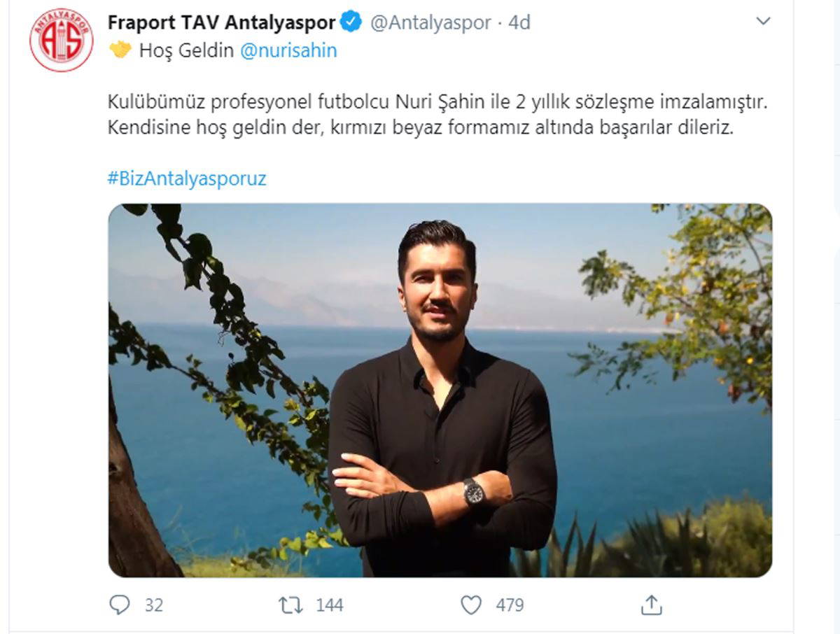 Bir döneme damgasını vuran Dortmund, Real Madrid, Liverpool ve son olarak da Werder Bremen formasını giyen (A) Milli futbolcu Nuri Şahin, Antalyaspor'la anlaştı. 88 doğumlu futbolcu Antalyaspor ile 2 yıllık sözleşme yaptı. Antalyaspor da anlaşmayı resmen açıkladı.