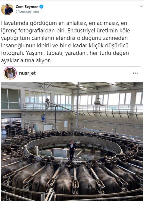 İnstagram hesabından paylaştığı fotoğrafla gündem olan Nusret Gökçe birçok kişinin tepkisini çekti. Gökçe, “Çok önemli bir toplantı” açıklamasıyla paylaştığı fotoğrafta, sağılmak için getirilen mandaların içinde poz verdi.