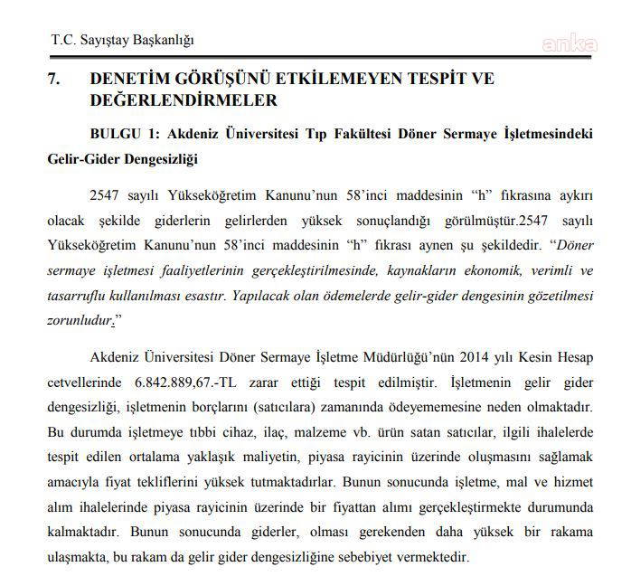 Sayıştay, 2014 yılı denetim raporunda Akdeniz Üniversitesi Tıp Fakültesi’nde 6 milyon 842 bin 889 lira 67 kuruş zarar tespit etti. Sayıştay denetçileri tespite ilişkin şu değerlendirmede bulundu: