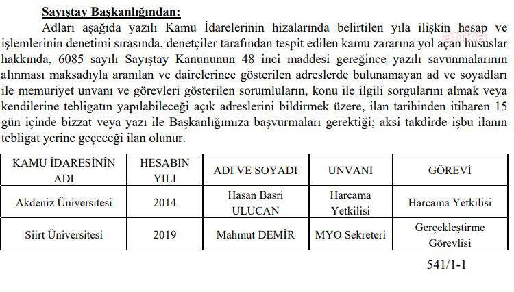 Sayıştay’ın adresinde bulamadığı sadece Ulucan değildi. Eski Siirt Üniversitesi Sağlık Hizmetleri Meslek Yüksek Okulu Sekreteri Mahmut Demir’in de 2019 yılında zarara yol açtığını belirten Sayıştay, onun da 15 gün içinde ifade vermesi gerektiğini duyurdu. Sayıştay’ın 2019 yılı denetim raporunda ise Demir’in yol açtığı kaydedilen zarara ilişkin hususların yer almadığı görüldü.